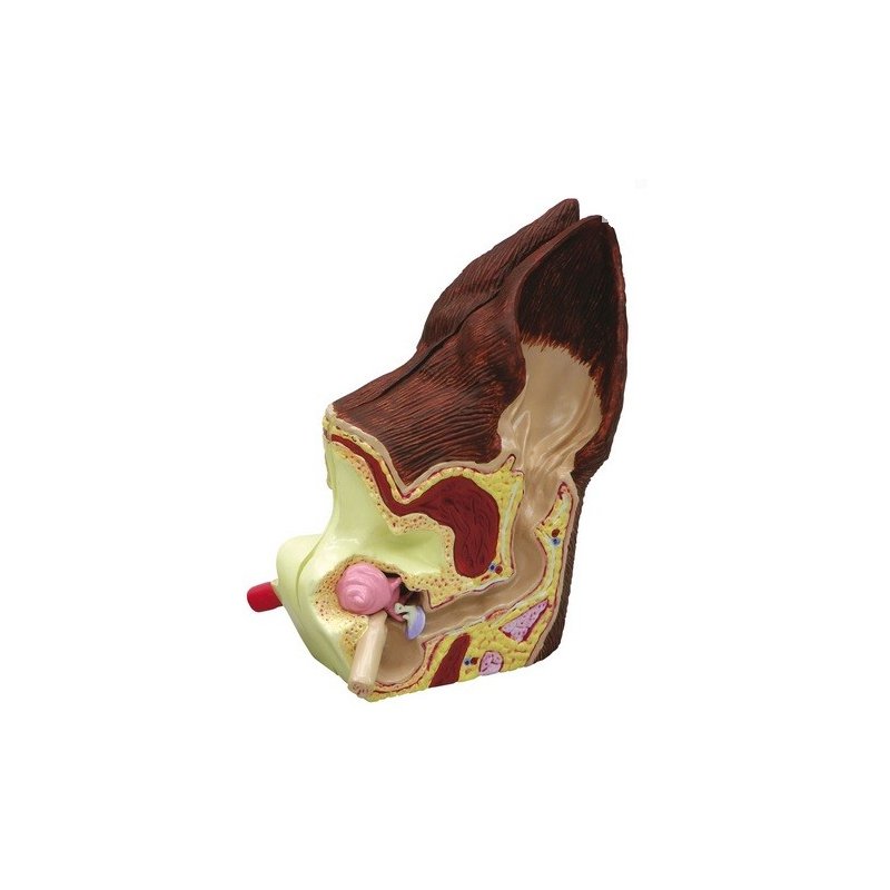 U nášho modelu na zdravej strane ucha je možné pozorovať vnútorné ucho s slimákom, sluchovú trubicu, sluchové kostičky, bubienkovú dutinu a vertikálnu a horizontálnu časť vonkajšieho zvukovodu.